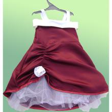 Elle est composée d’une jupe évasée, froncée sur le devant et d’une fleur en tissu. Le haut de la robe est de type bustier avec une fermeture à glissière sur le milieu dos. Doublure en tulle.